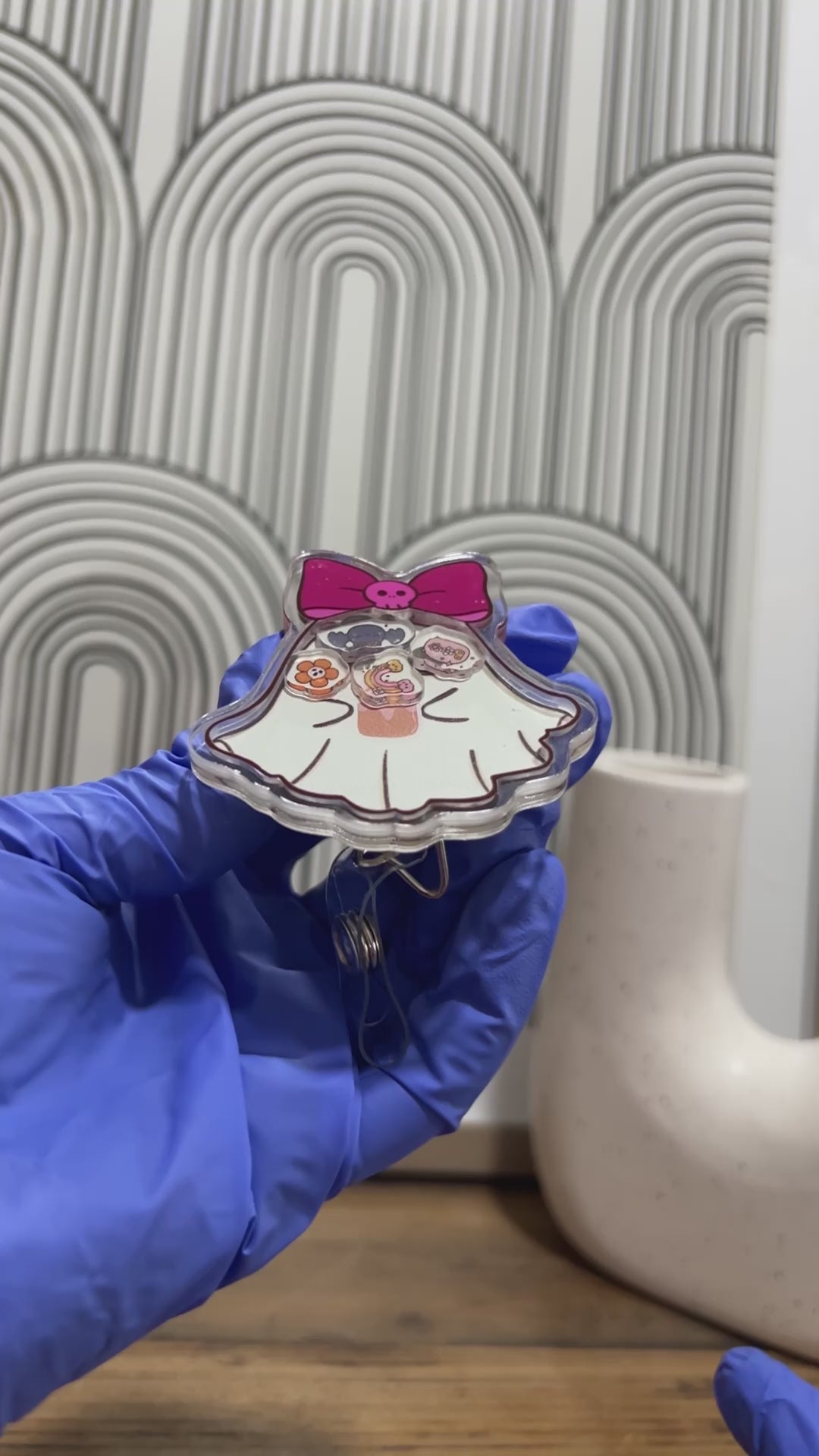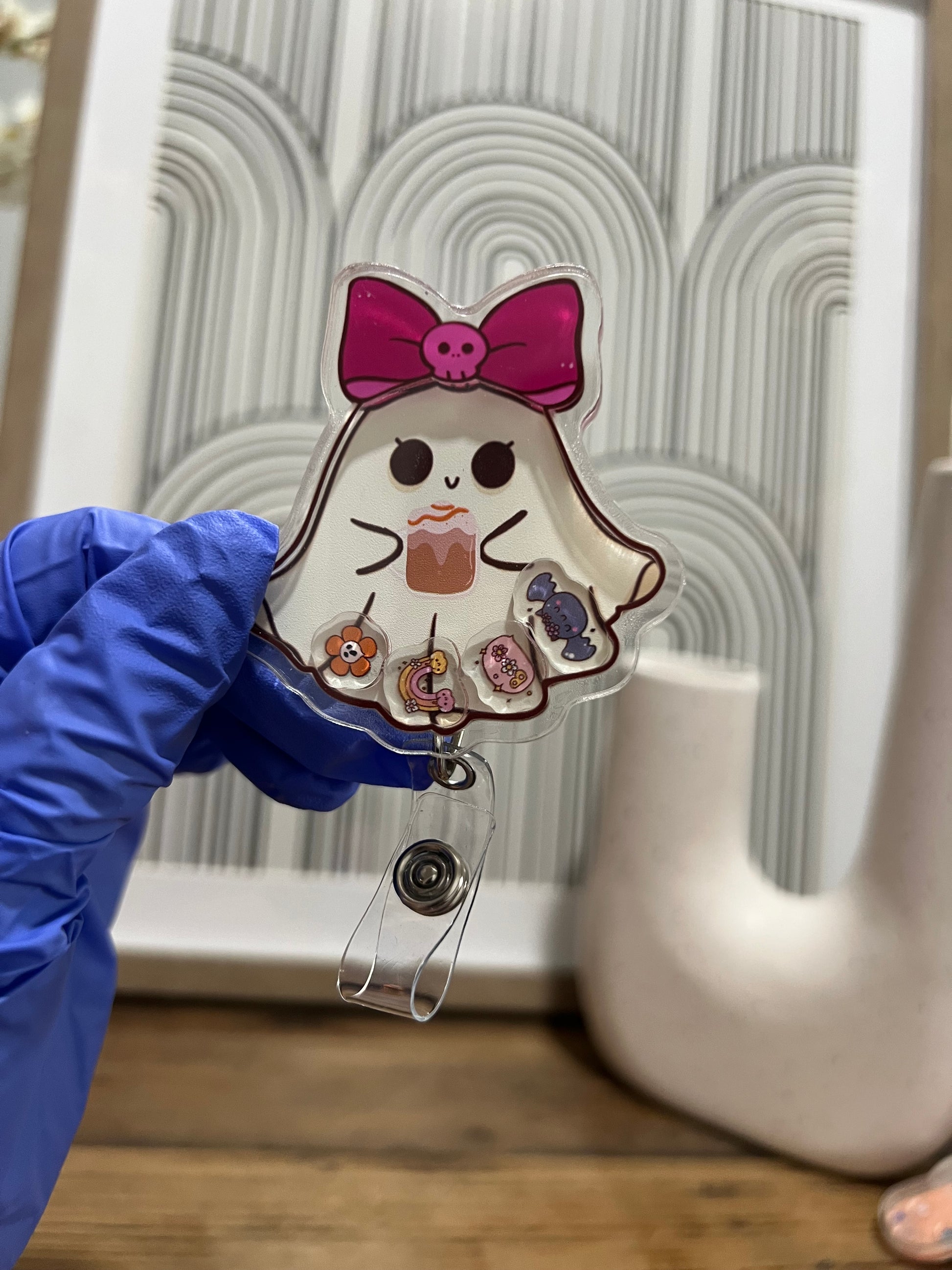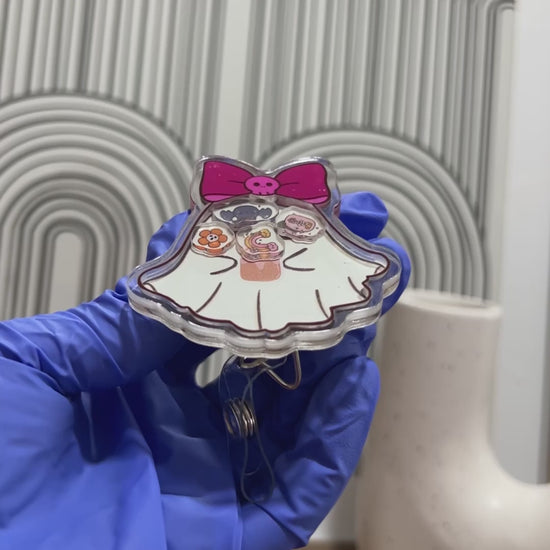 Elevate your badge game with our Shake Badge Reel! Featuring a girly ghost, coquette Halloween, and a cute pink bow ghost design, this reel adds a touch of spooky cuteness to any outfit. Perfect for showing off your love for Halloween and adding some fun to your workday. Get ready for some spooky vibes and grab yours today!