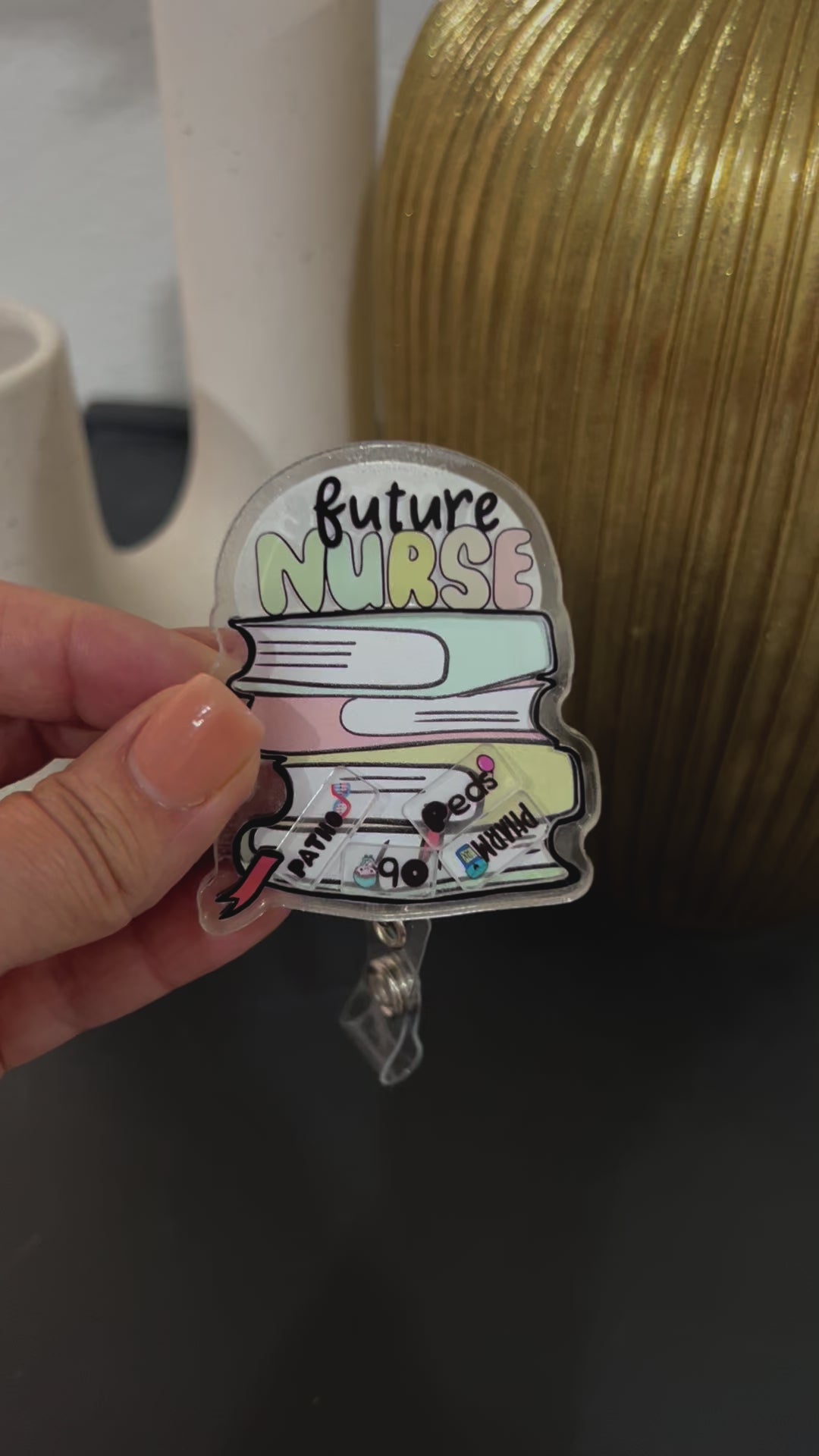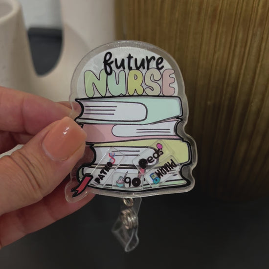 This Shaker badge reel features the phrase "Future Nurse" and a book design. Perfect for displaying your professional identity or to show your passion for nursing. Made with quality materials, it is durable and practical for everyday use.
