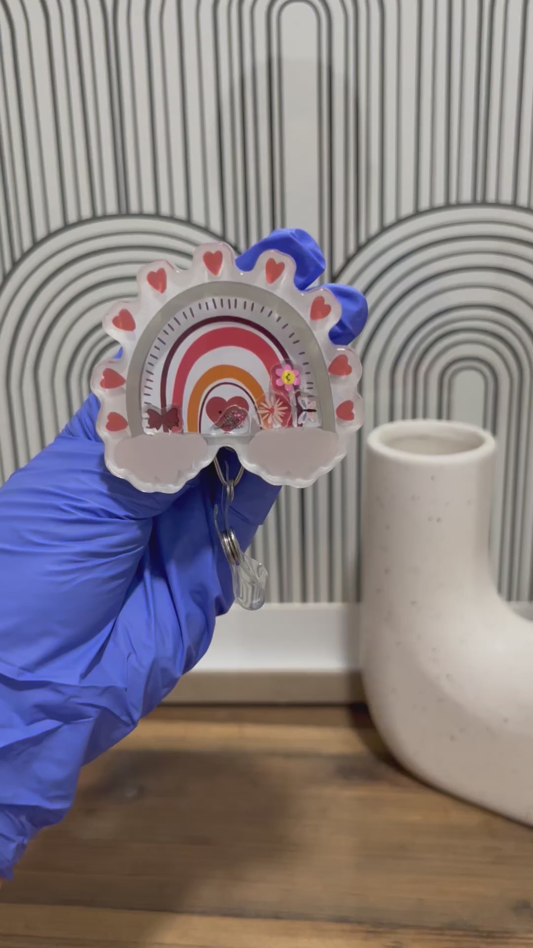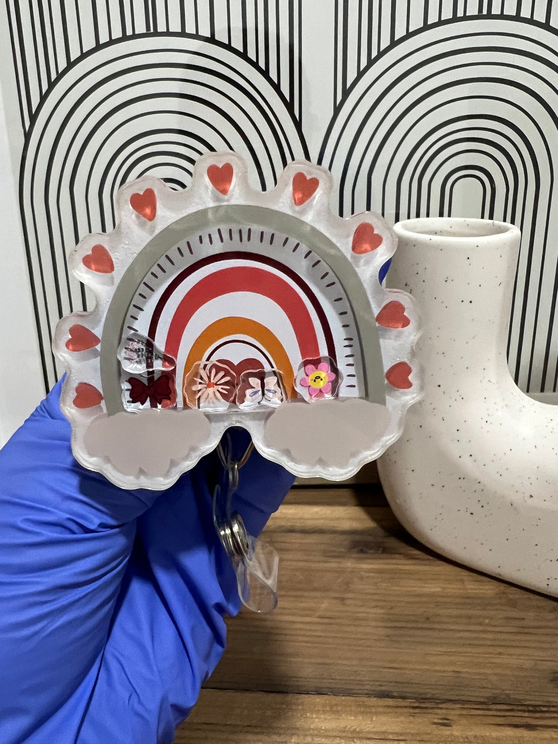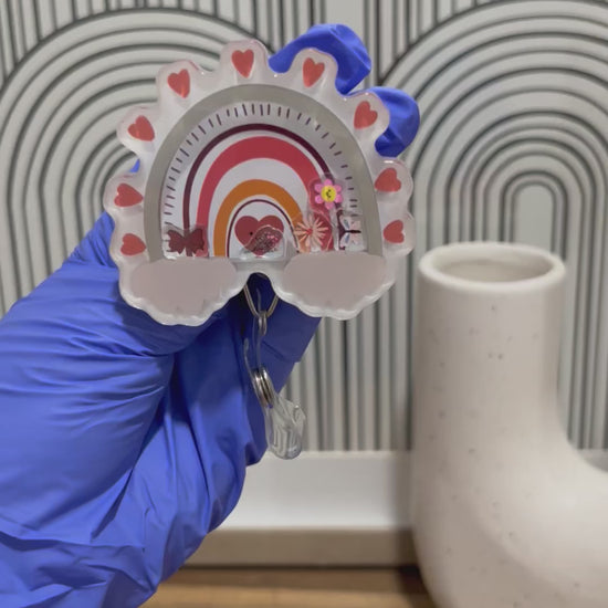 Elevate your ID game with our Shaker Badge Reel: Boho rainbow! This unique accessory features a cute bow, vibrant flowers, and a playful butterfly that shake inside, adding a touch of whimsy to your workday. Show off your personality and keep your badge within easy reach with this must-have item.