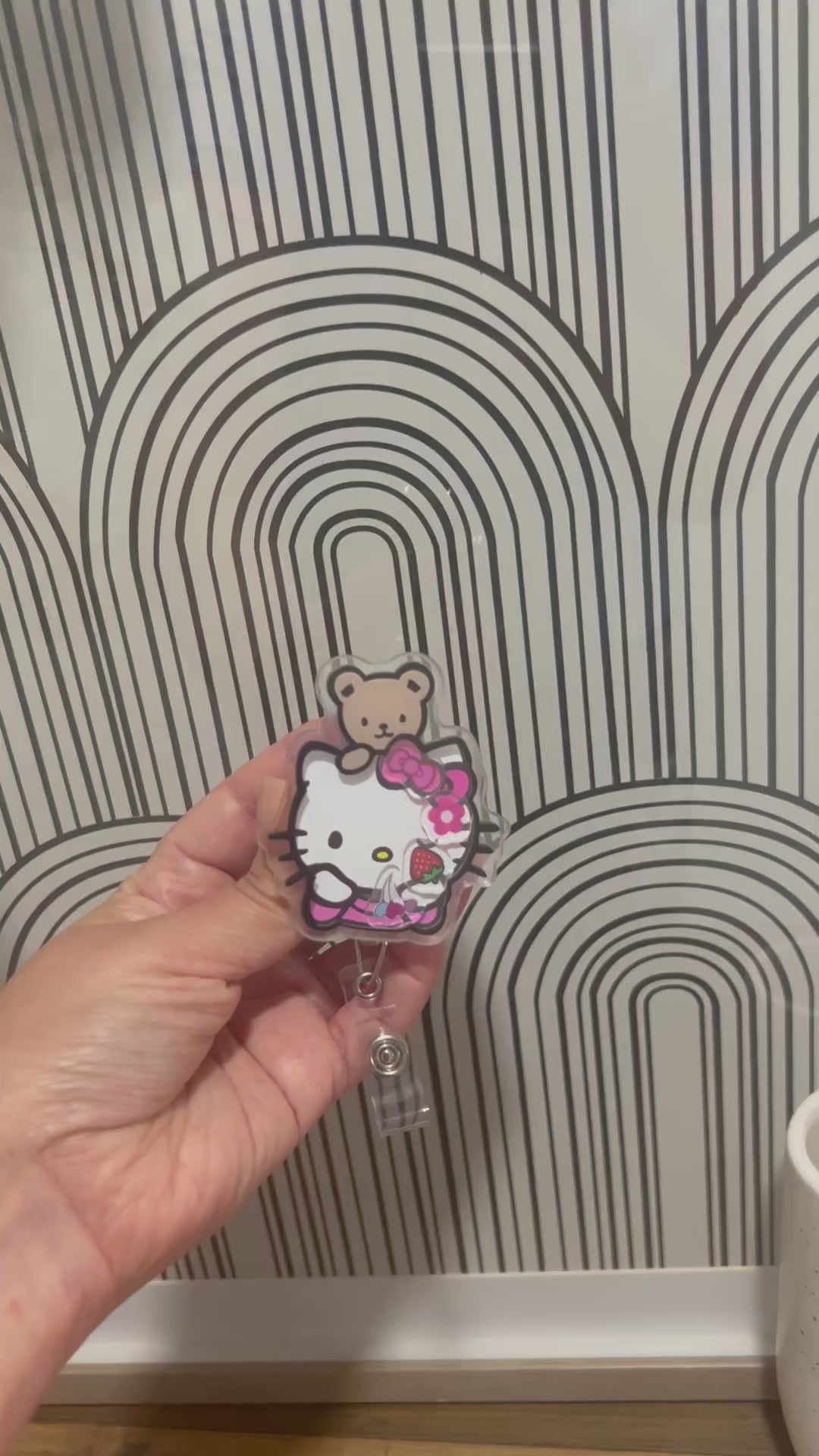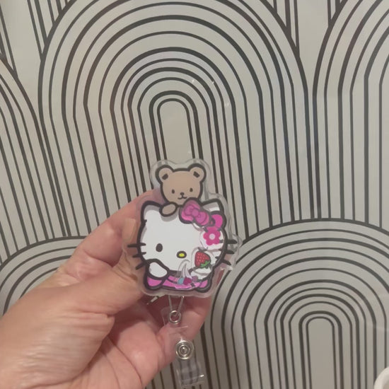 Introducing the charismatic and adorable Shaker Badge Reel featuring Hello Kitty and her bear friend! Keep your ID easily accessible and add some fun to your workday with this high-quality badge reel. A must-have for any Hello Kitty fan, the shaker design adds a touch of playfulness to your work ensemble.