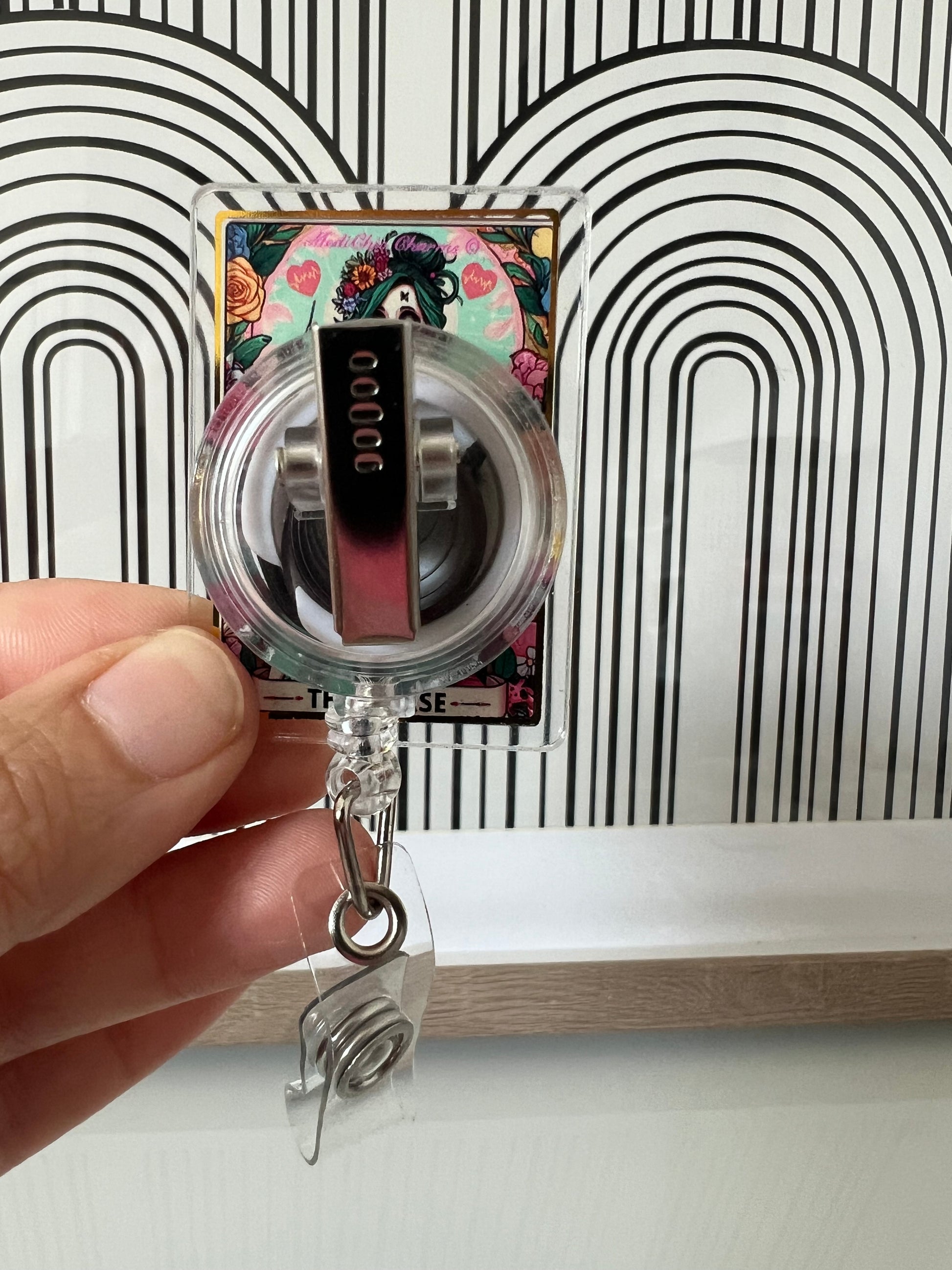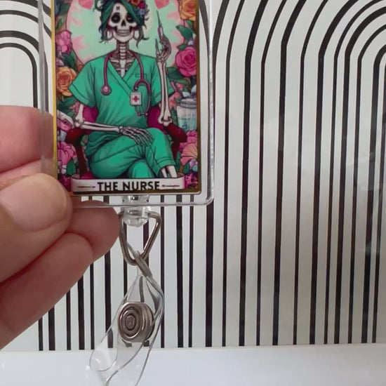Elevate your nursing game with The Nurse Tarot Card badge reel. Featuring a whimsical Skeleton Nurse design, this gift for registered nurses is both functional and stylish. Add some witchy flair to your scrubs with this nursing skull badge reel.